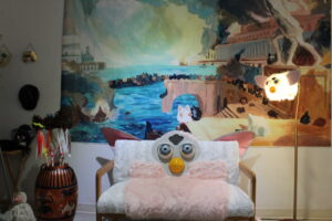 Other works of note were an interactive piece that allowed you to stick knives into a Furby and a painting called “Saint,” showing a valiant female Furby knight bearing a sword.. In one section of the gallery, people posed for photos perched on a couch decorated with Furbies. Viewers couldn’t help cracking up over another piece on view, a Furby-themed toilet.
