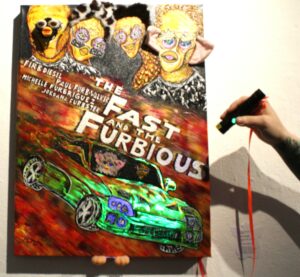 On the opening night of this year’s “Friday the Furbteenth,” DJ DarkenDabe played electronic music while visitors admired various artworks, including “Fast and the Furbious,” a piece riffing on posters from the “Fast and Furious” movies, backlit with UV light so it glowed green, plus a homemade video showing a person in a Furby mask fighting a silver-painted moth creature to spoof the old “Godzilla” movies.