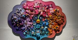 One striking piece, "I Spy Furby," a painting with a Furby mounted at the center, surrounded by vibrant colors, served as a love letter to all things Furby.